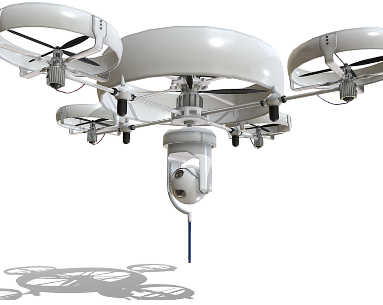 Drone táctico con animaciones de vuelo, hélices realistas y materiales metálicos.